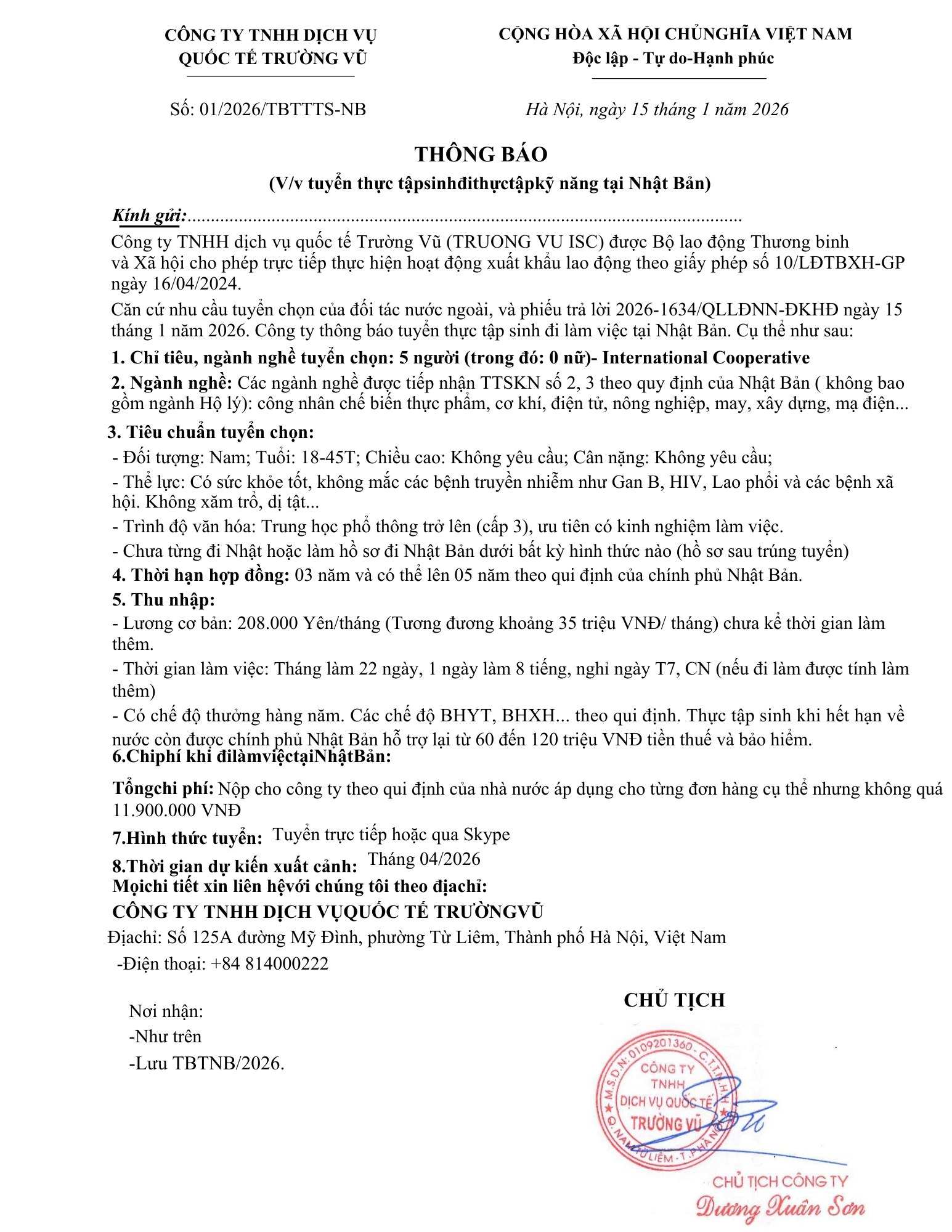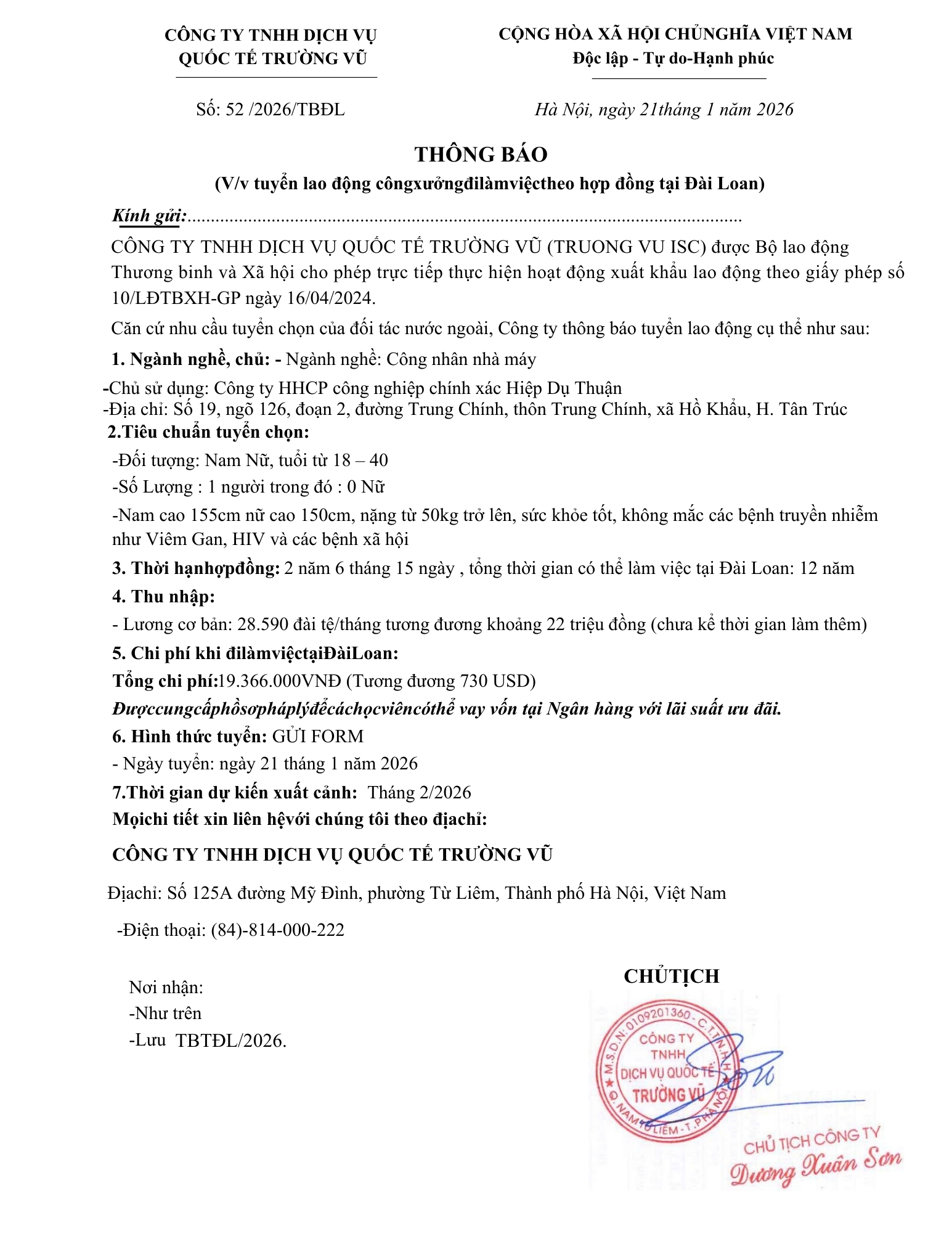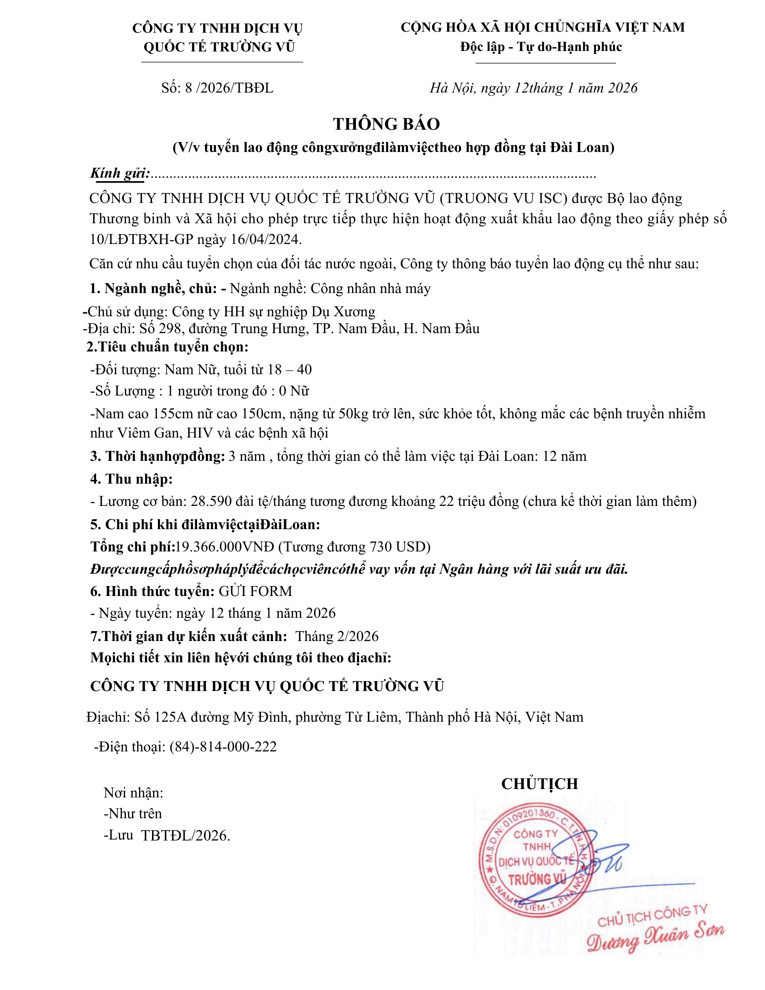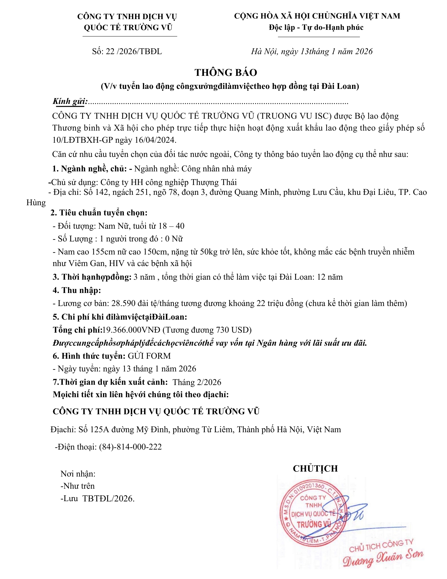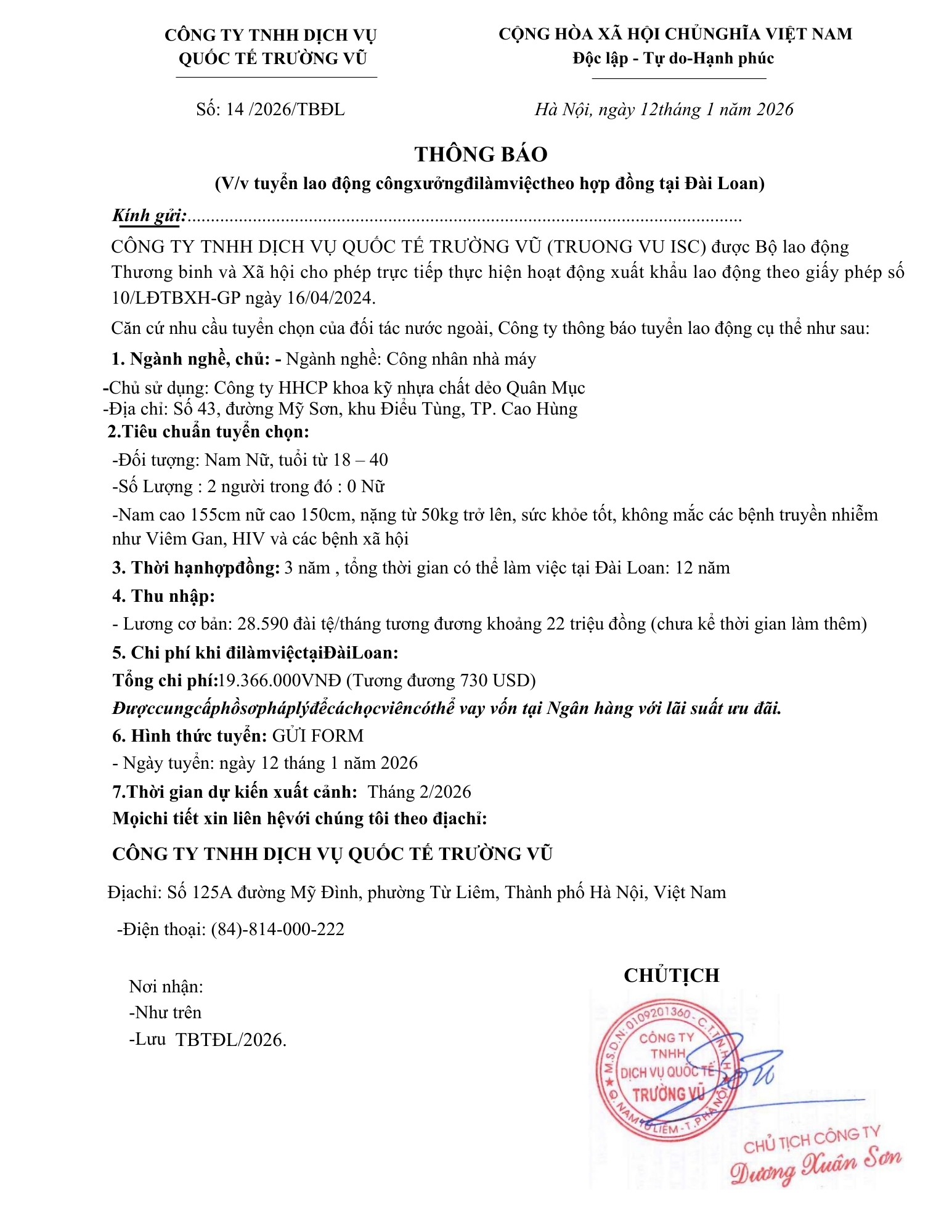 Tin tức, Tuyển dụngThông báo tuyển dụng lao động đi làm việc tại Đài Loan và Nhật Bản tháng 1 năm 2026 27 Tháng 2, 202627 Tháng 2, 2026 - Trường vũ - 177 lượt xem
