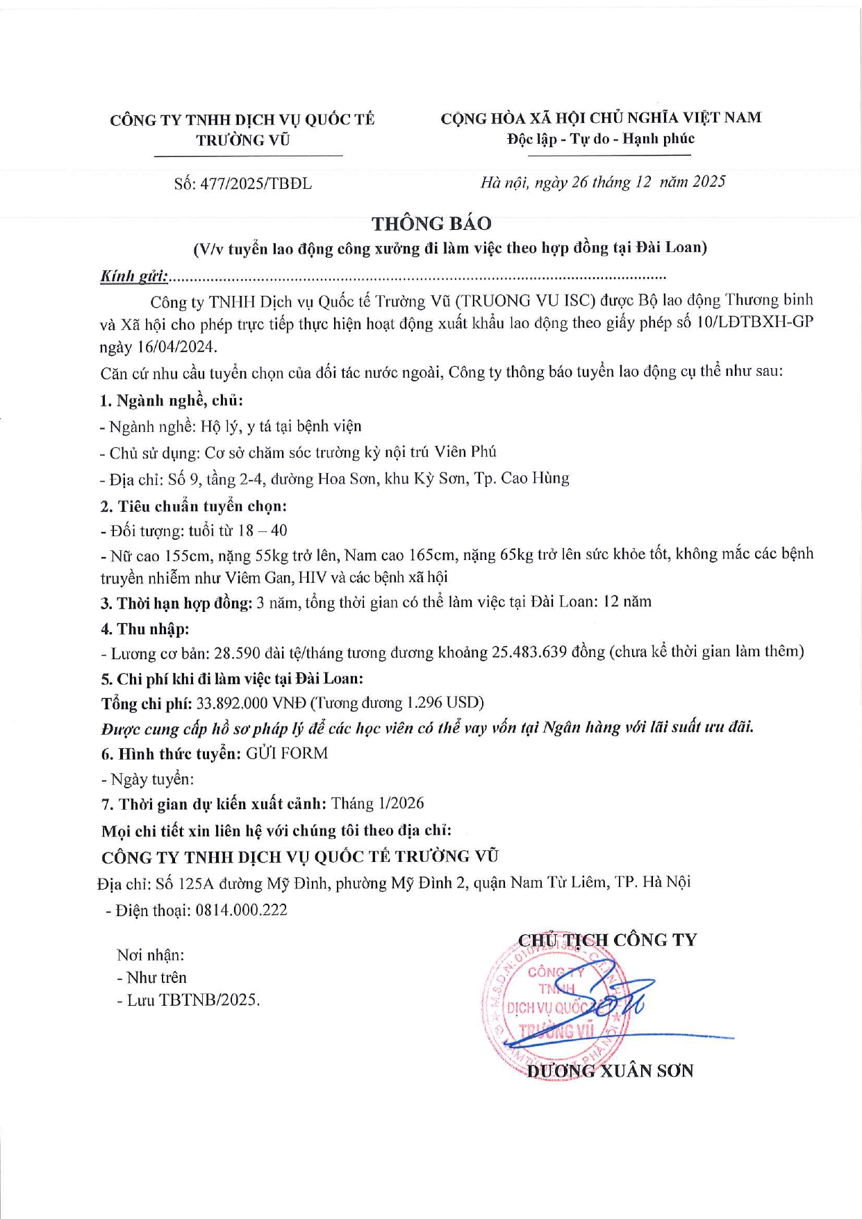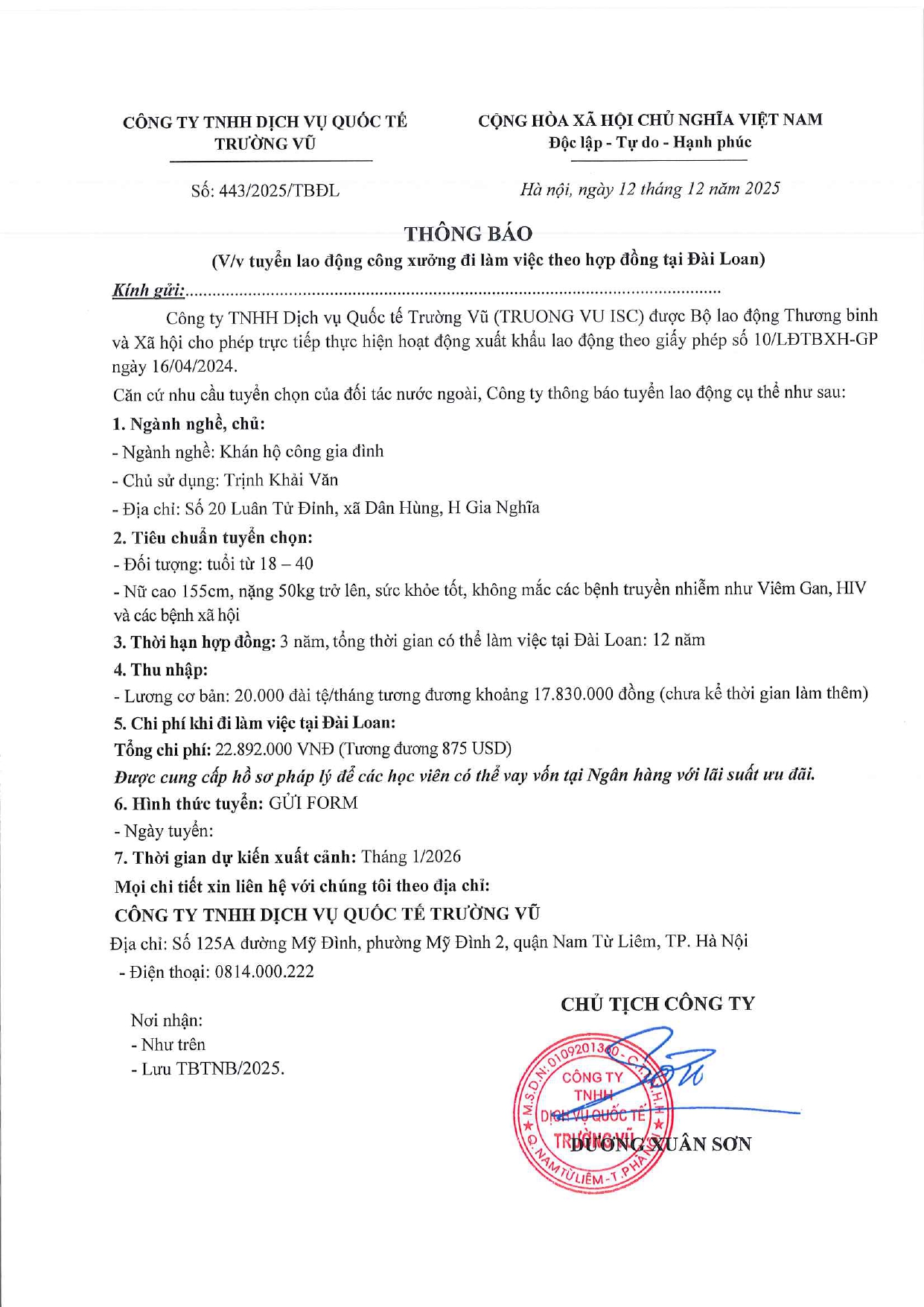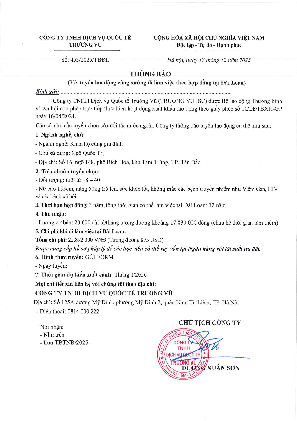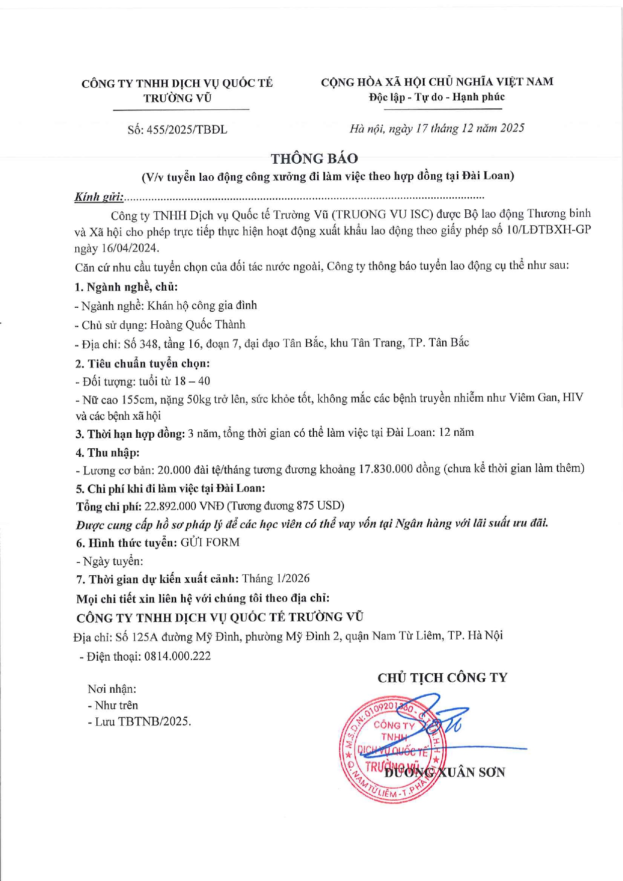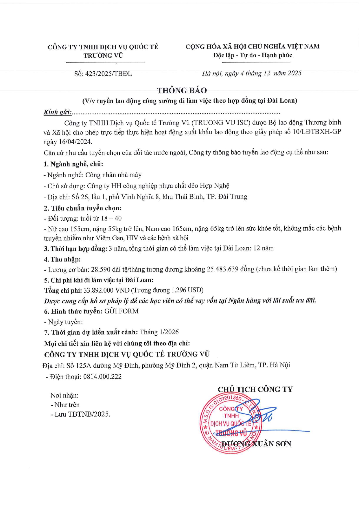 Tin tức, Tin tức về lĩnh vực du học, Tuyển dụngThông báo tuyển dụng lao động làm việc tại Đài Loan tháng 12 năm 2025 15 Tháng 1, 2026 - Trường vũ - 12 lượt xem