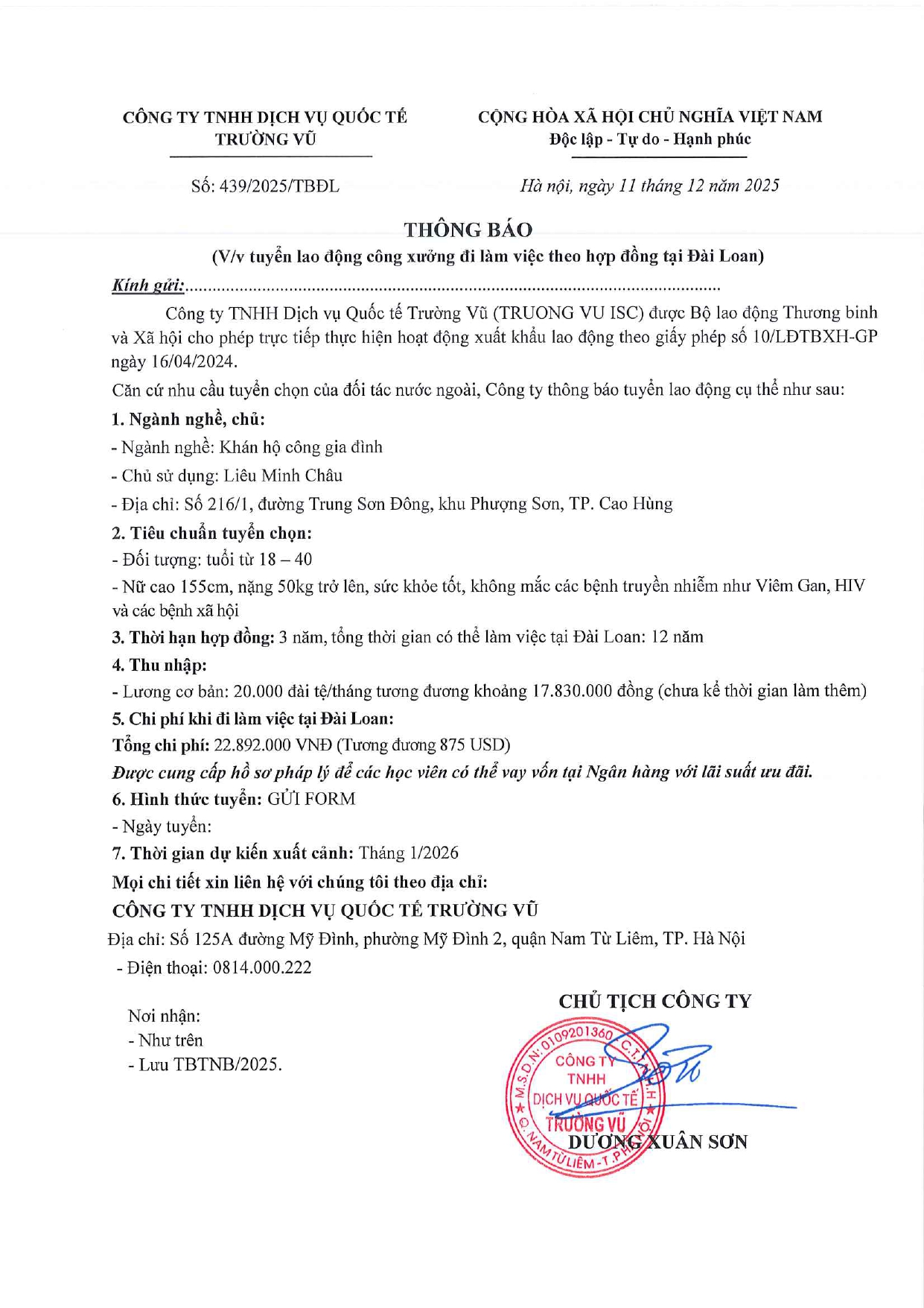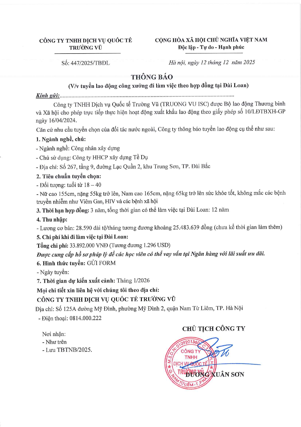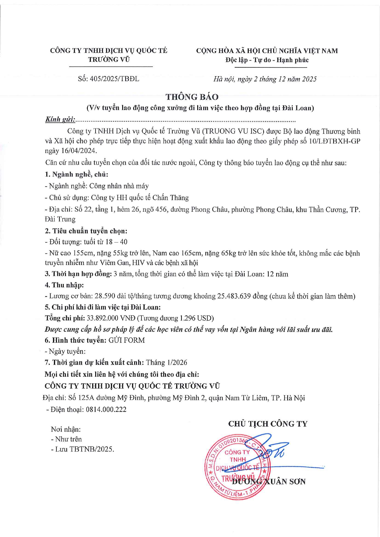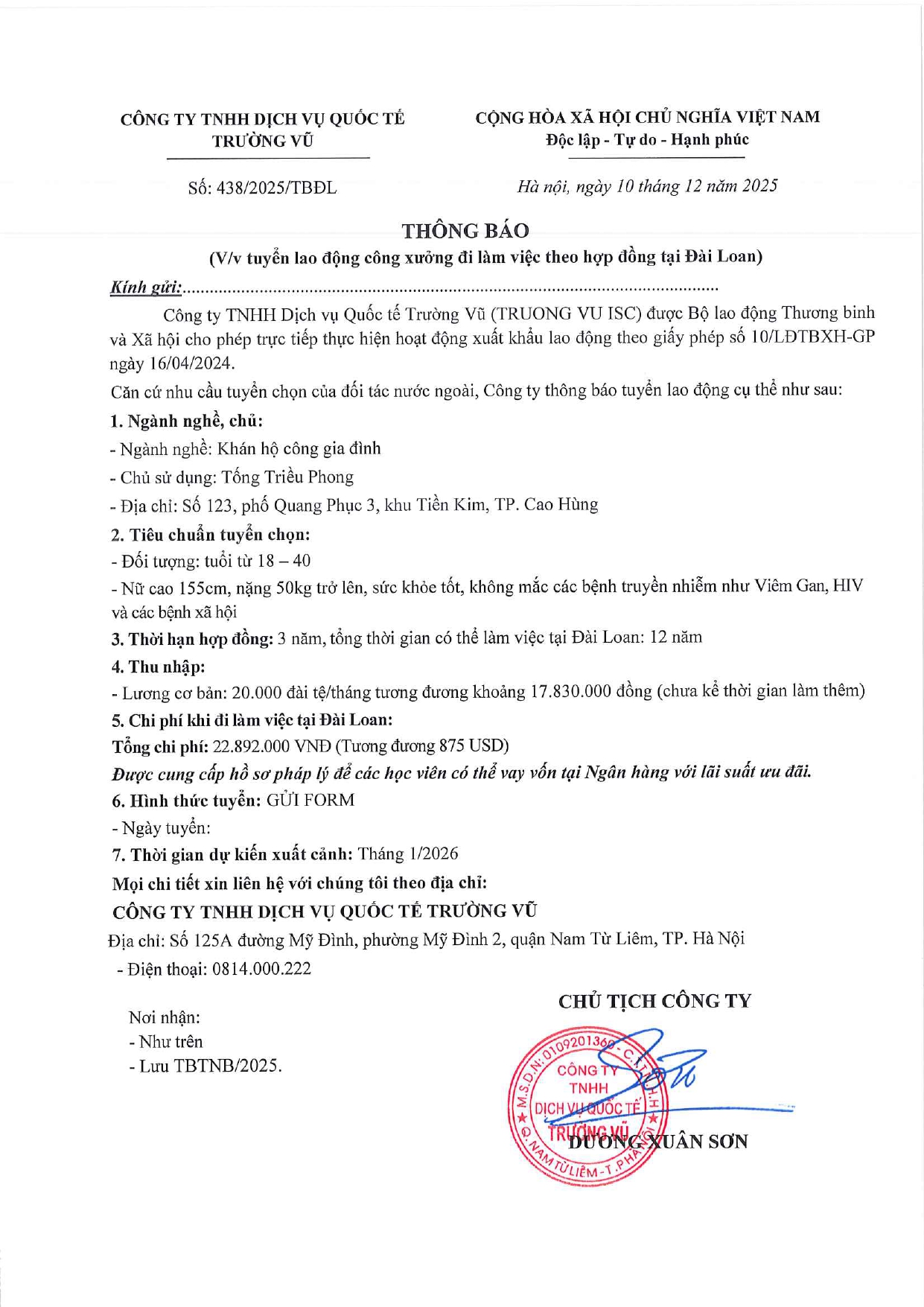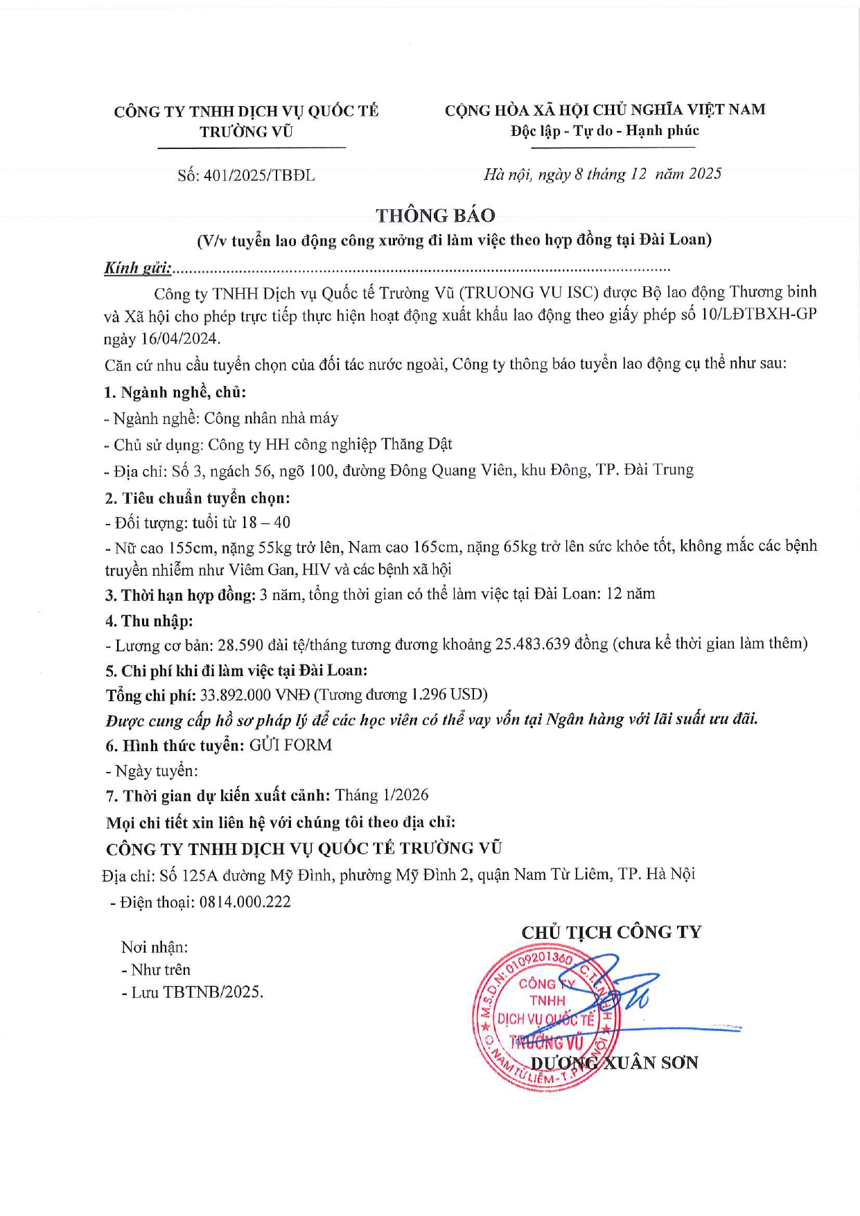 Tin tức, Tin tức về lĩnh vực du học, Tuyển dụngThông báo tuyển dụng lao động làm việc tại Đài Loan tháng 12 năm 2025 15 Tháng 1, 2026 - Trường vũ - 12 lượt xem