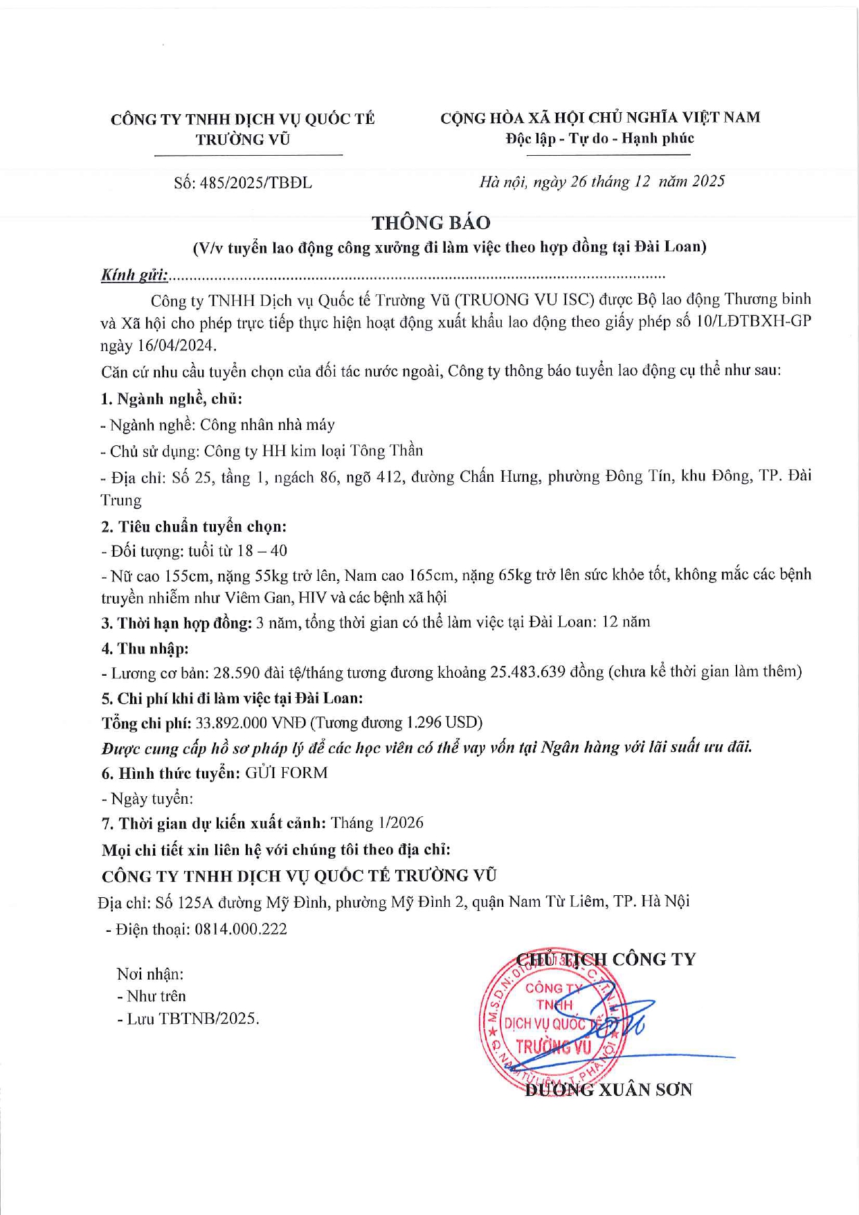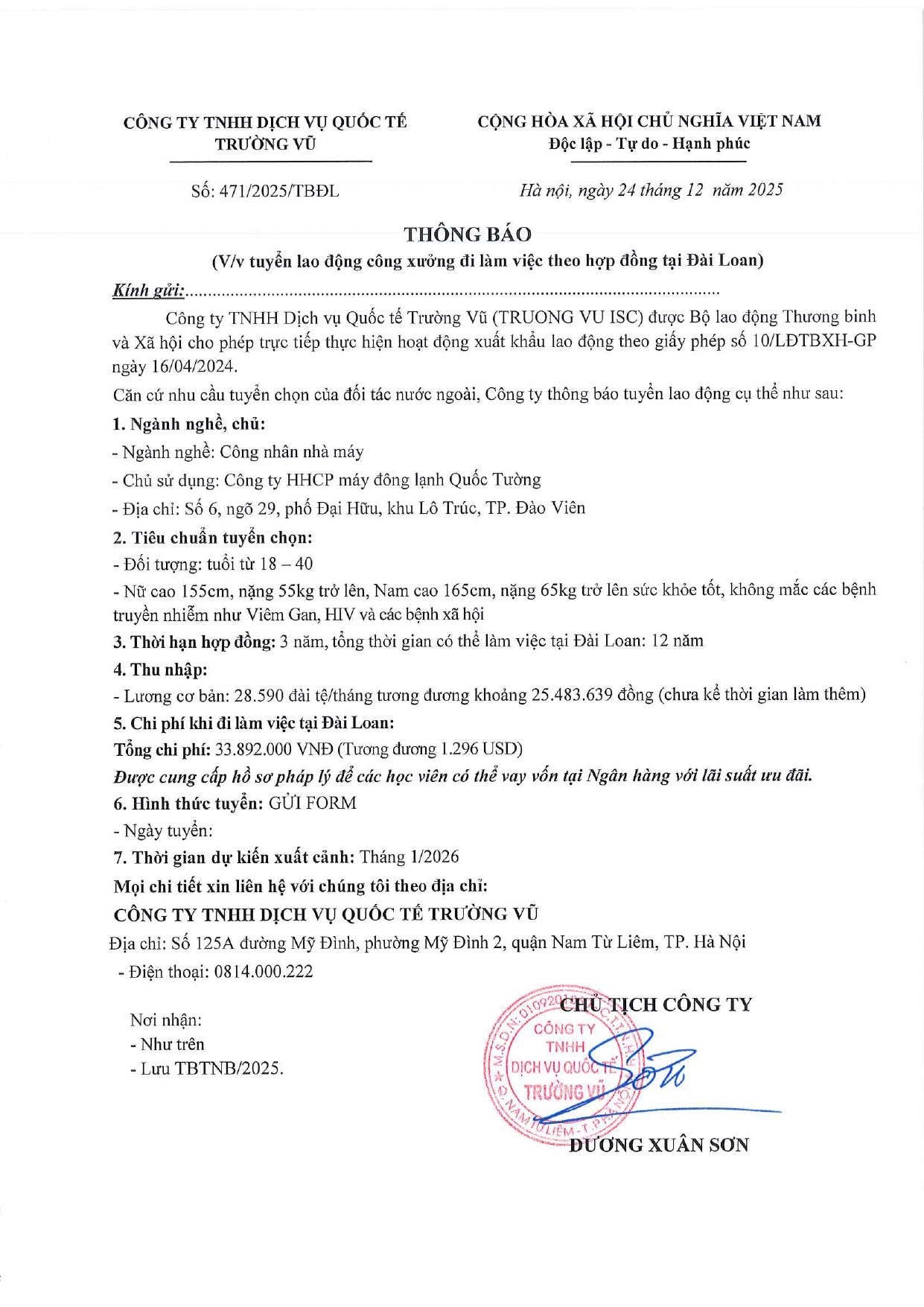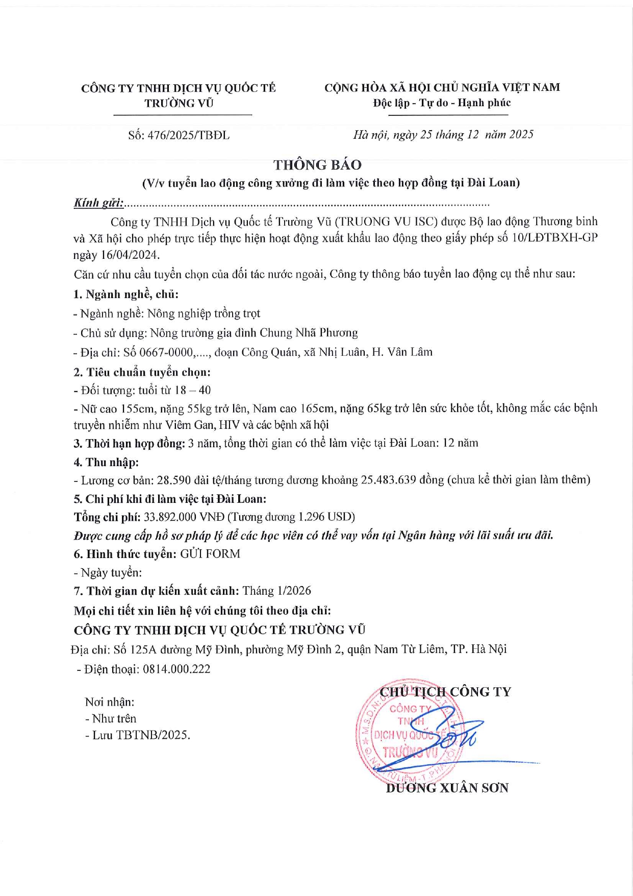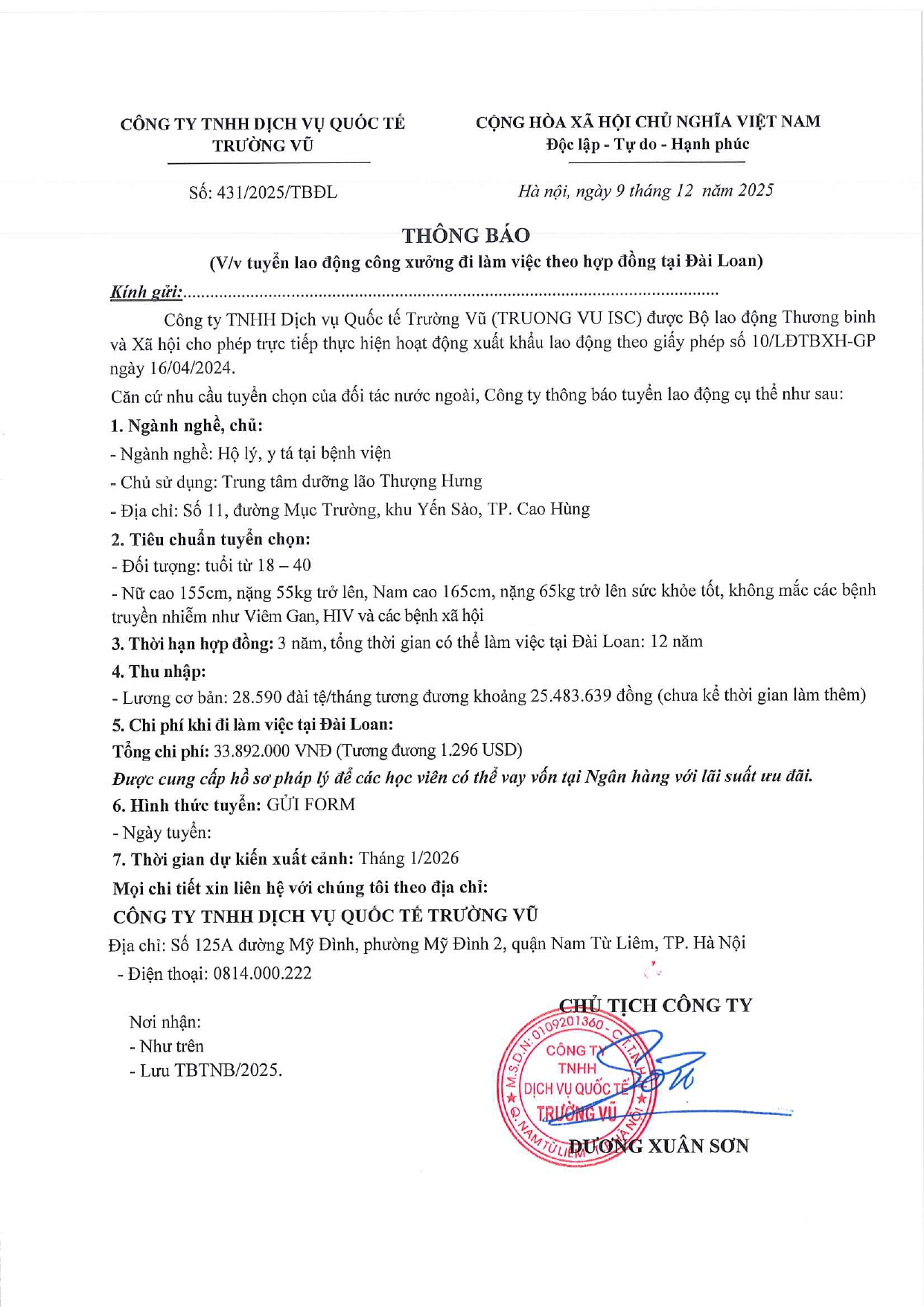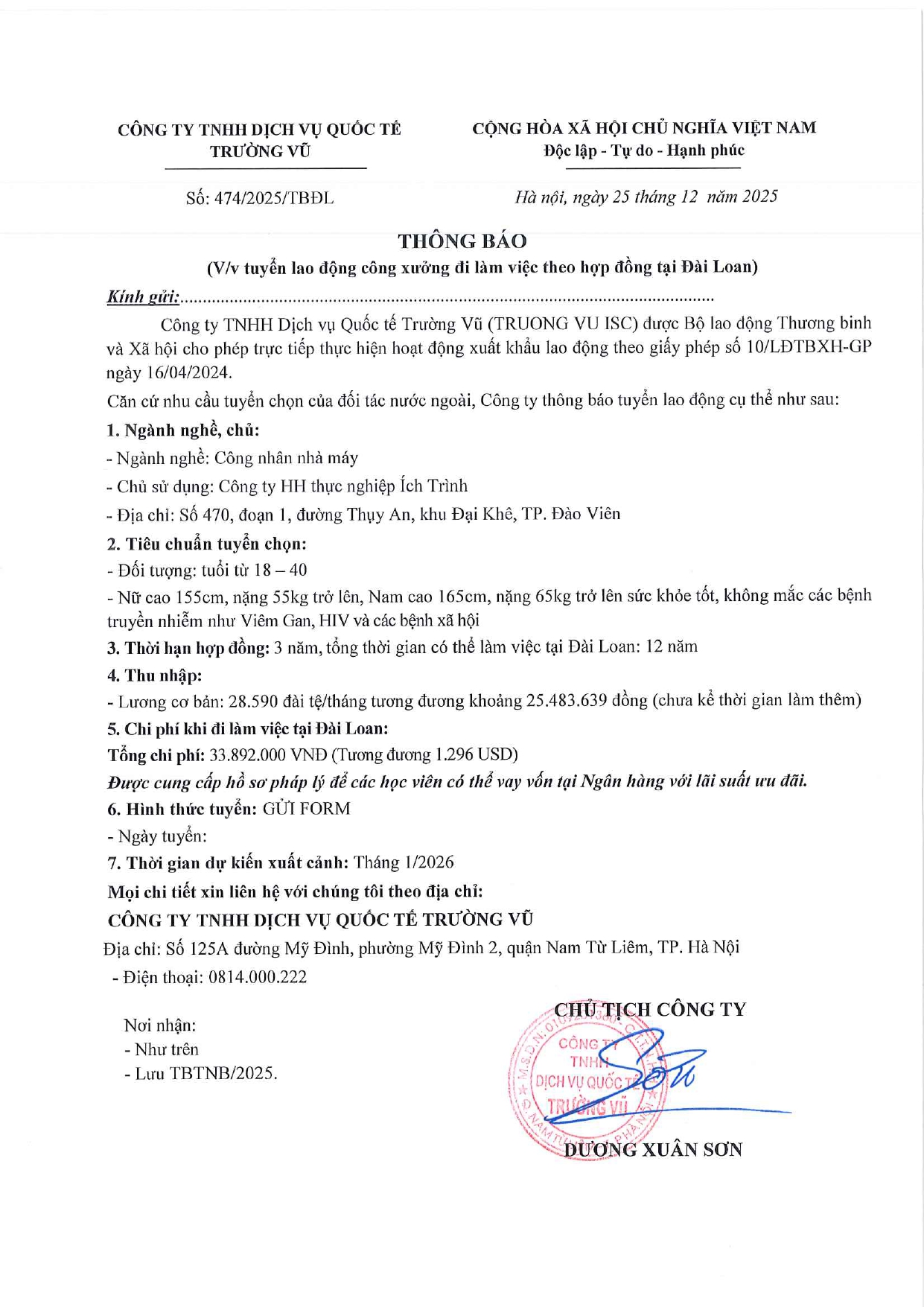 Tin tức, Tin tức về lĩnh vực du học, Tuyển dụngThông báo tuyển dụng lao động làm việc tại Đài Loan tháng 12 năm 2025 15 Tháng 1, 2026 - Trường vũ - 12 lượt xem