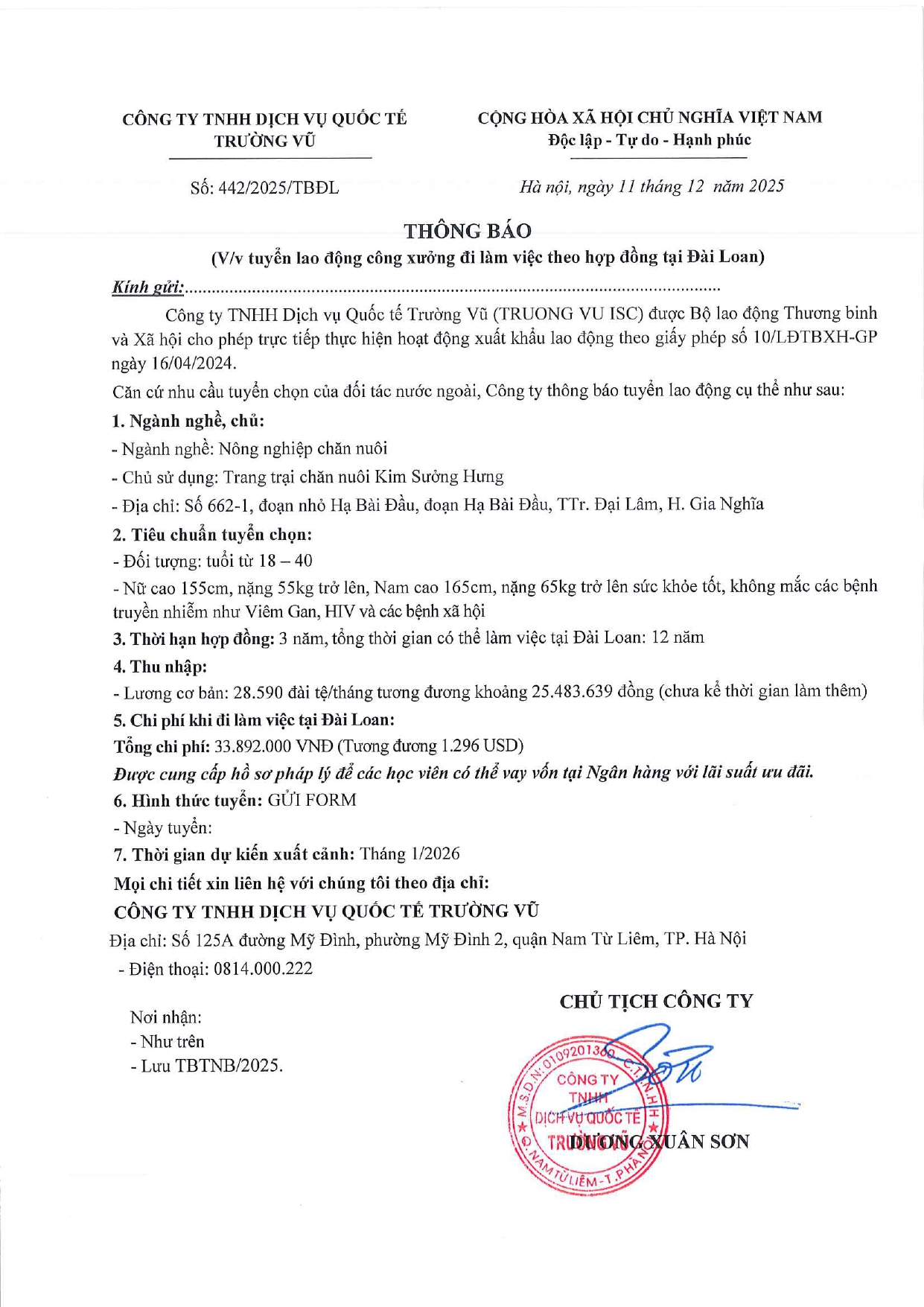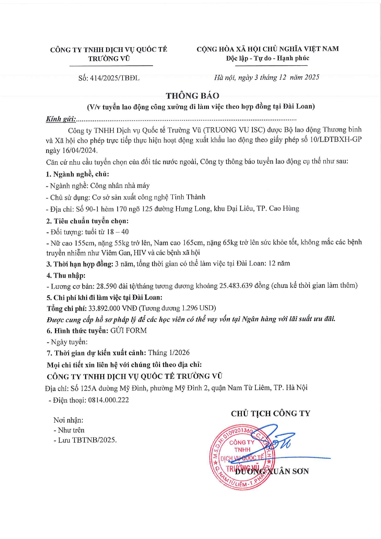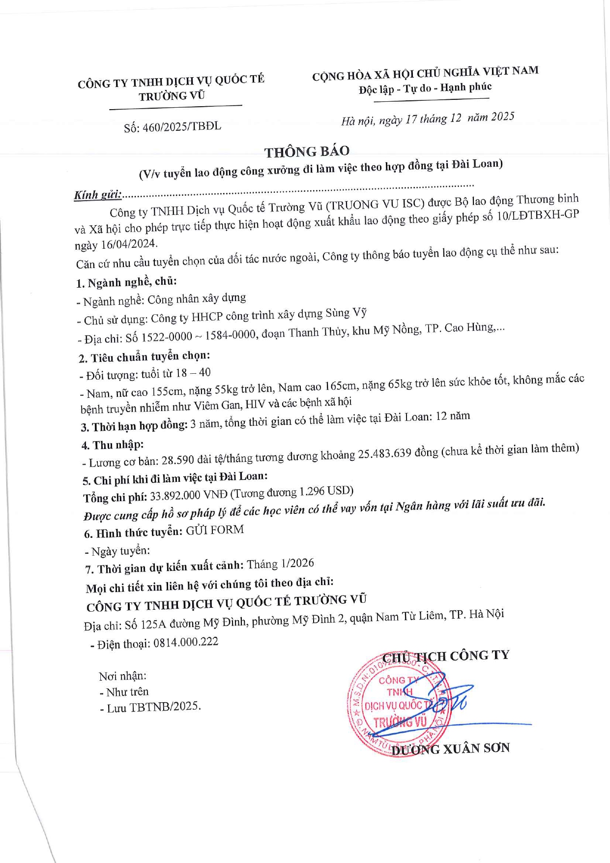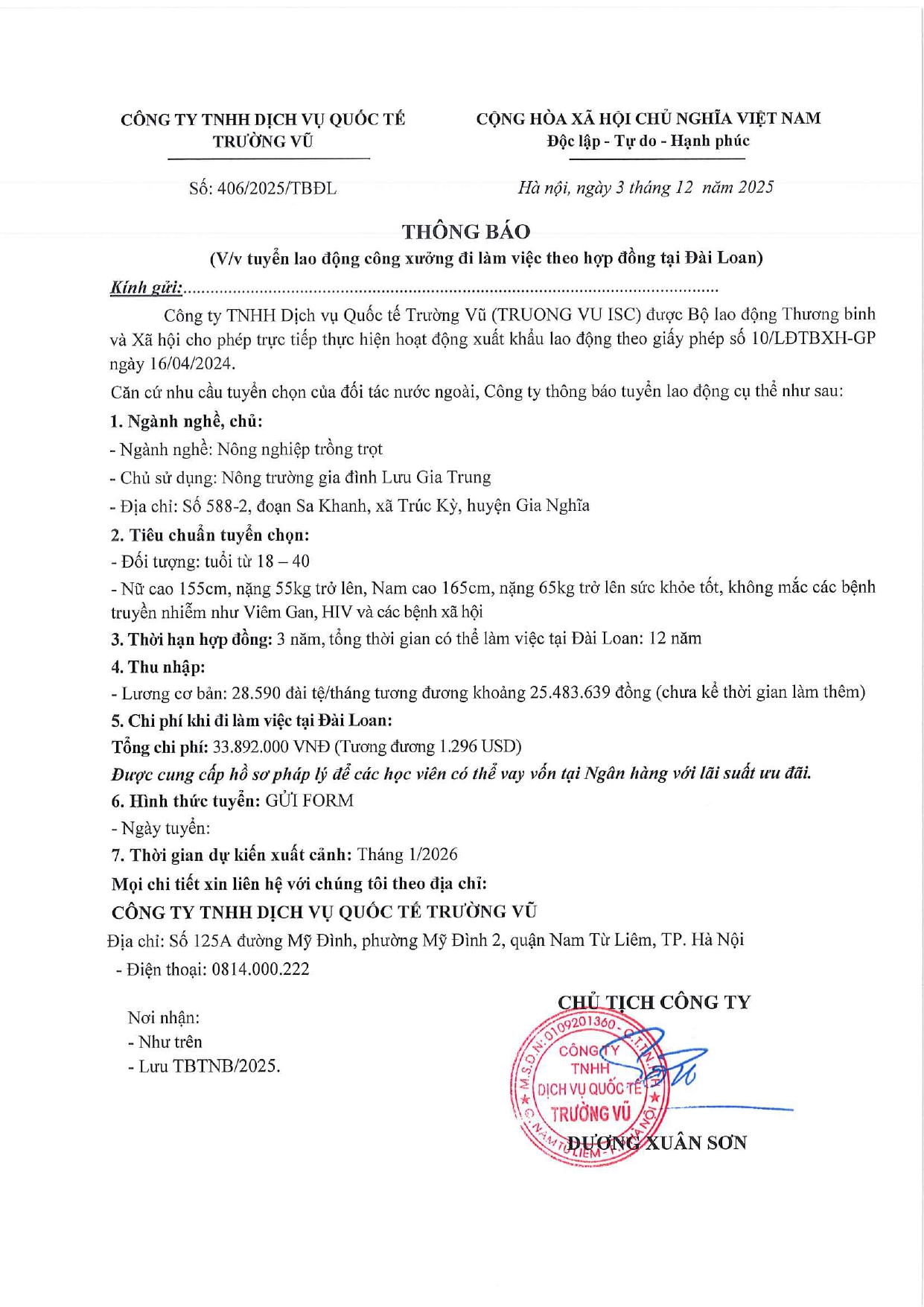 Tin tức, Tin tức về lĩnh vực du học, Tuyển dụngThông báo tuyển dụng lao động làm việc tại Đài Loan tháng 12 năm 2025 15 Tháng 1, 2026 - Trường vũ - 12 lượt xem