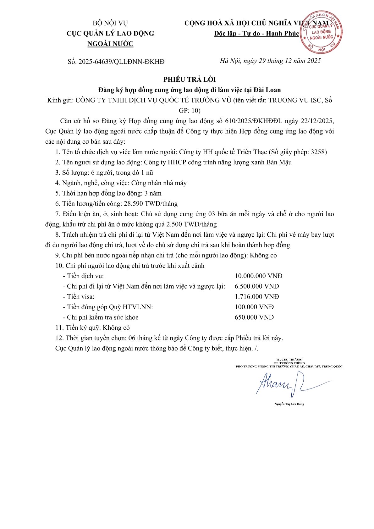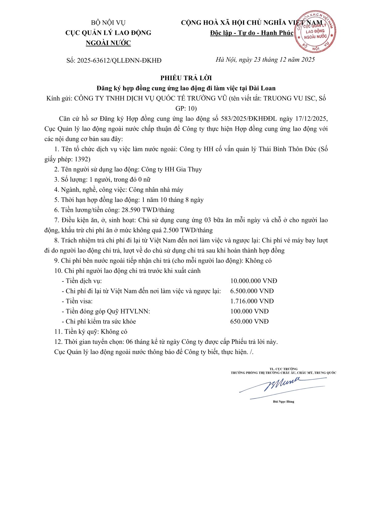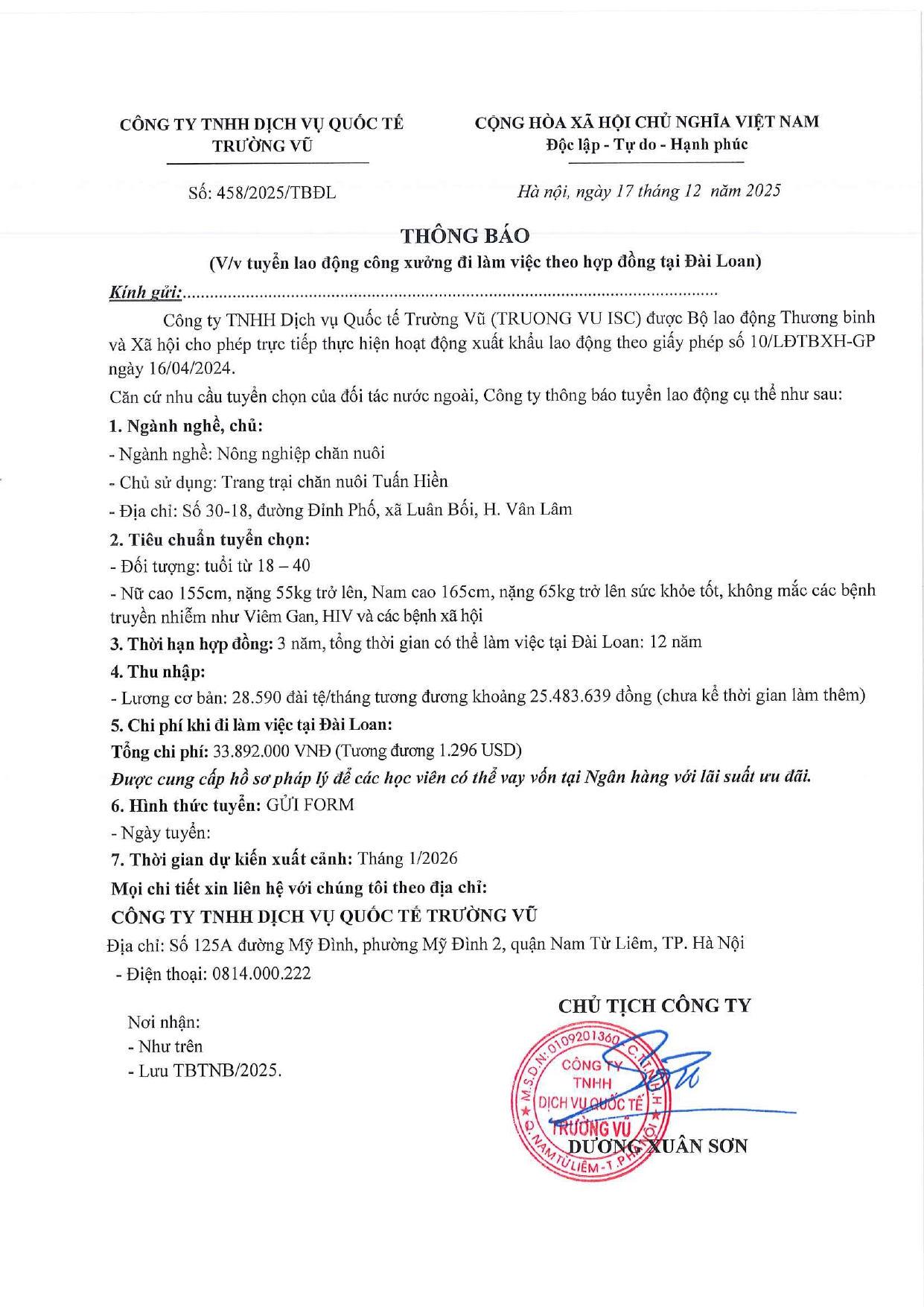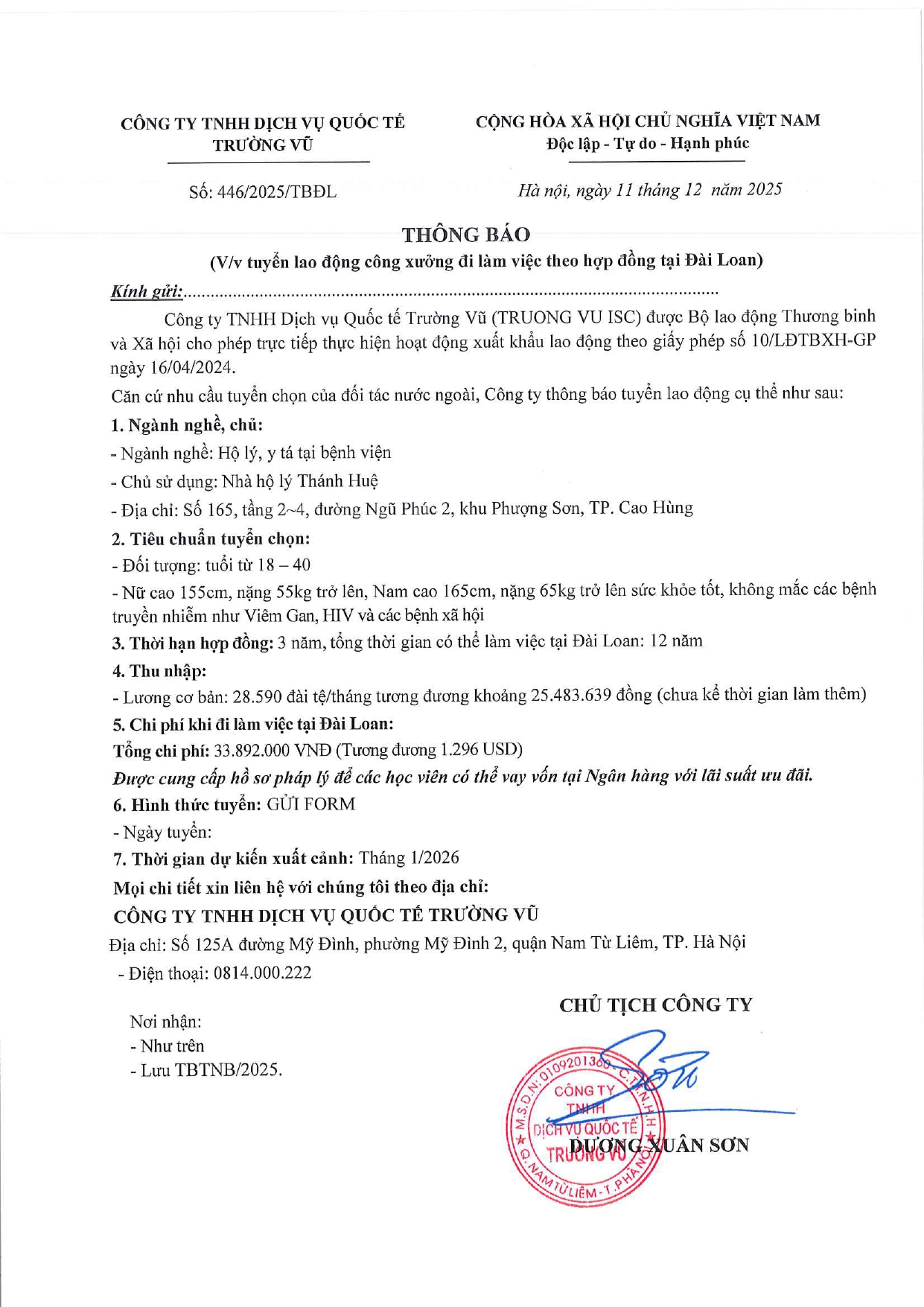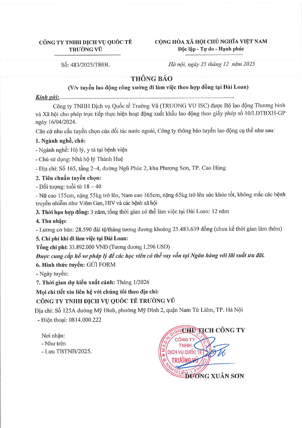 Tin tức, Tin tức về lĩnh vực du học, Tuyển dụngThông báo tuyển dụng lao động làm việc tại Đài Loan tháng 12 năm 2025 15 Tháng 1, 2026 - Trường vũ - 12 lượt xem