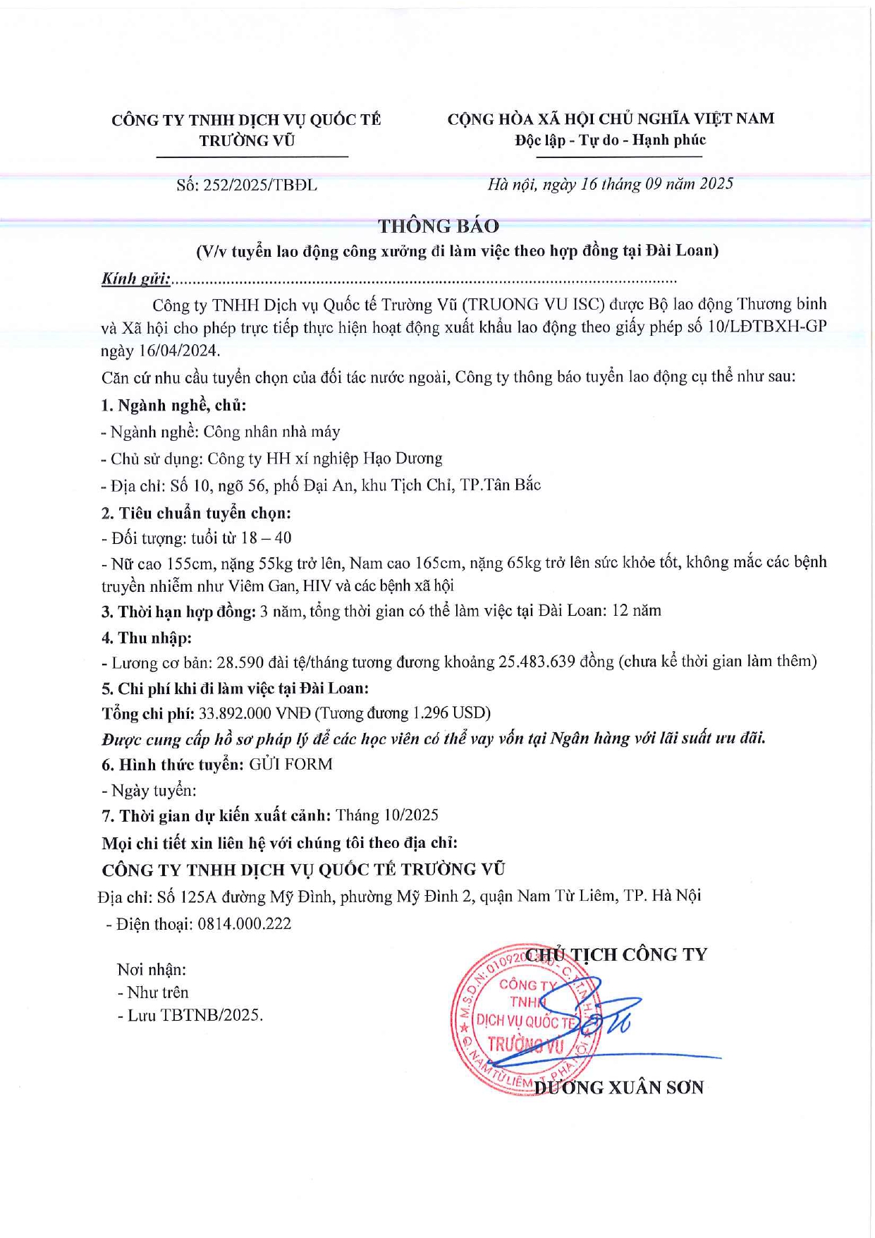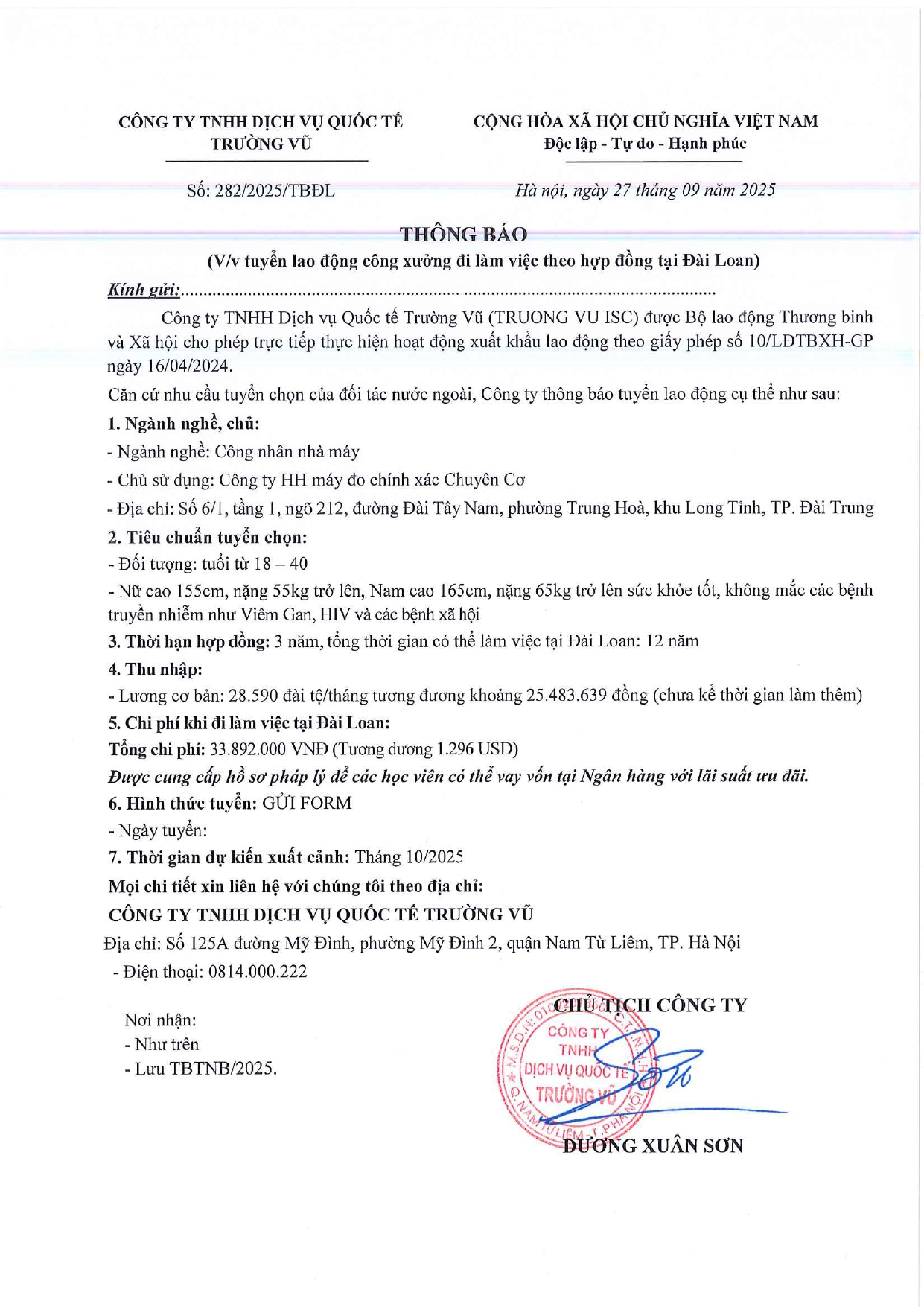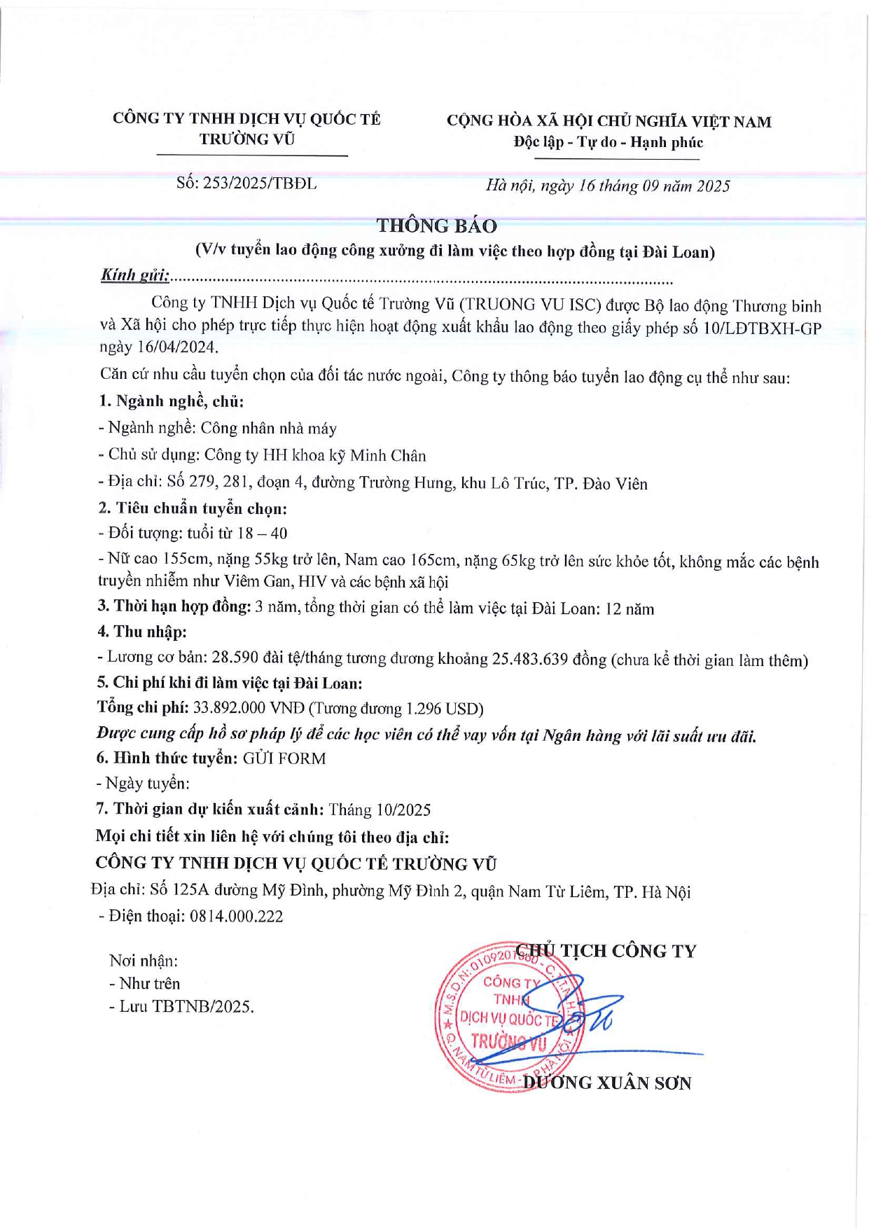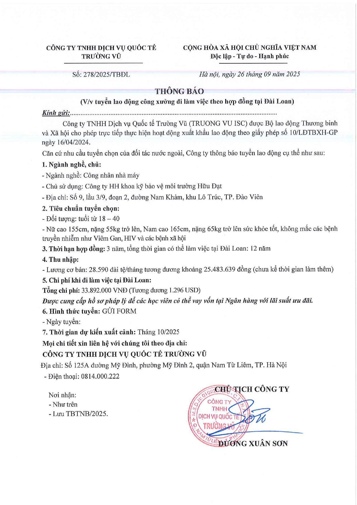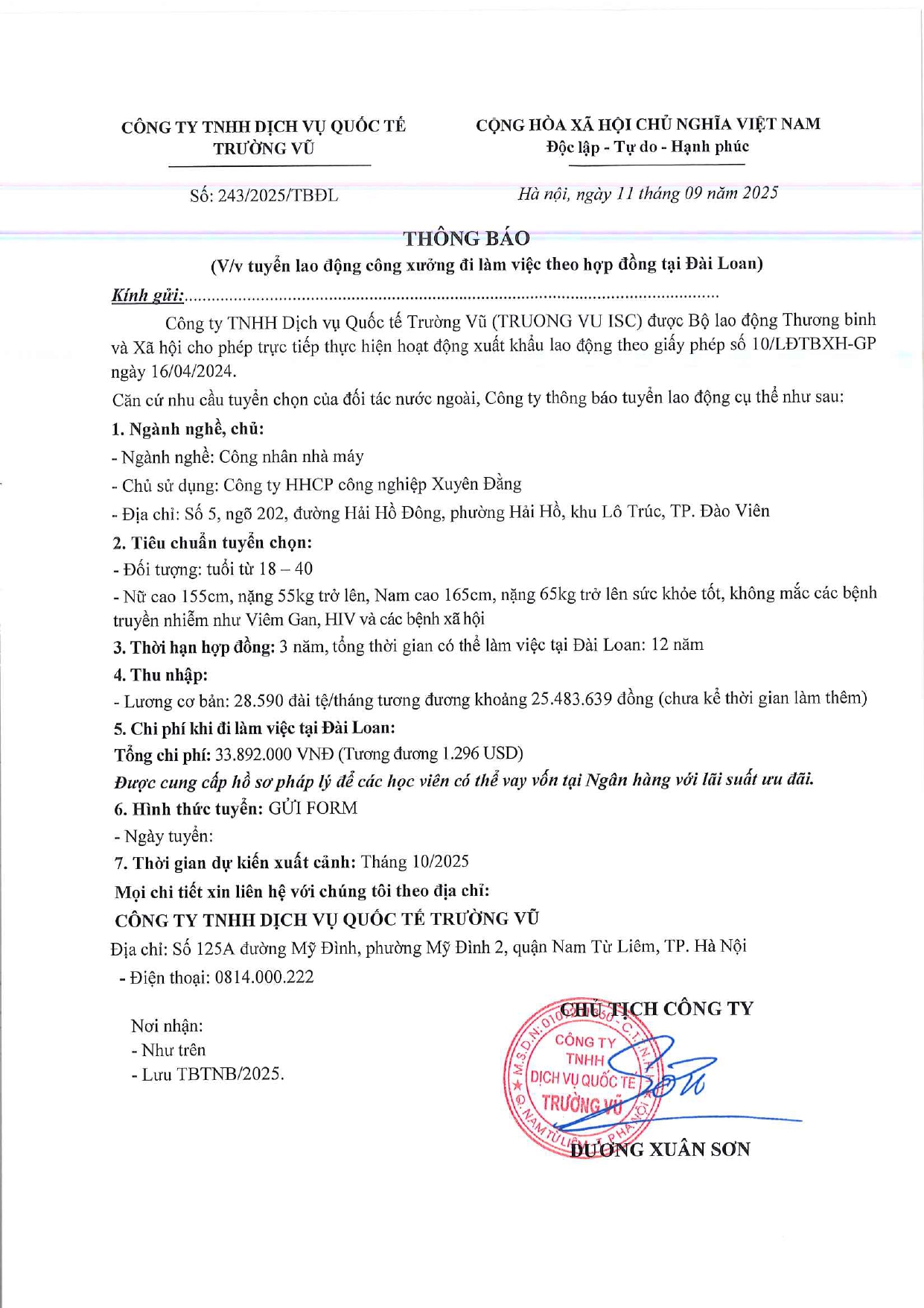Tin tức, Tin tức về thị trường lao động, Tuyển dụngThông báo tuyển dụng lao động làm việc tại Đài Loan tháng 9 năm 2025 17 Tháng 10, 202512 Tháng mười một, 2025 - Trường vũ - 188 lượt xem