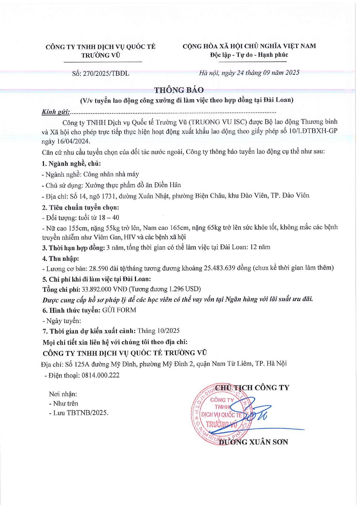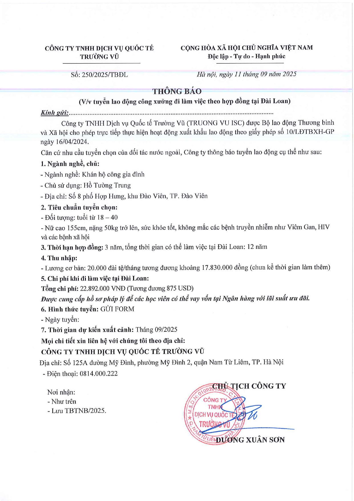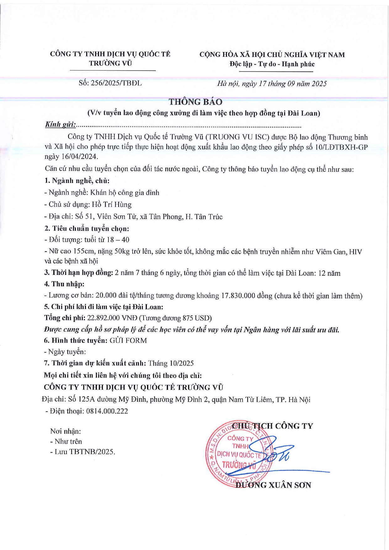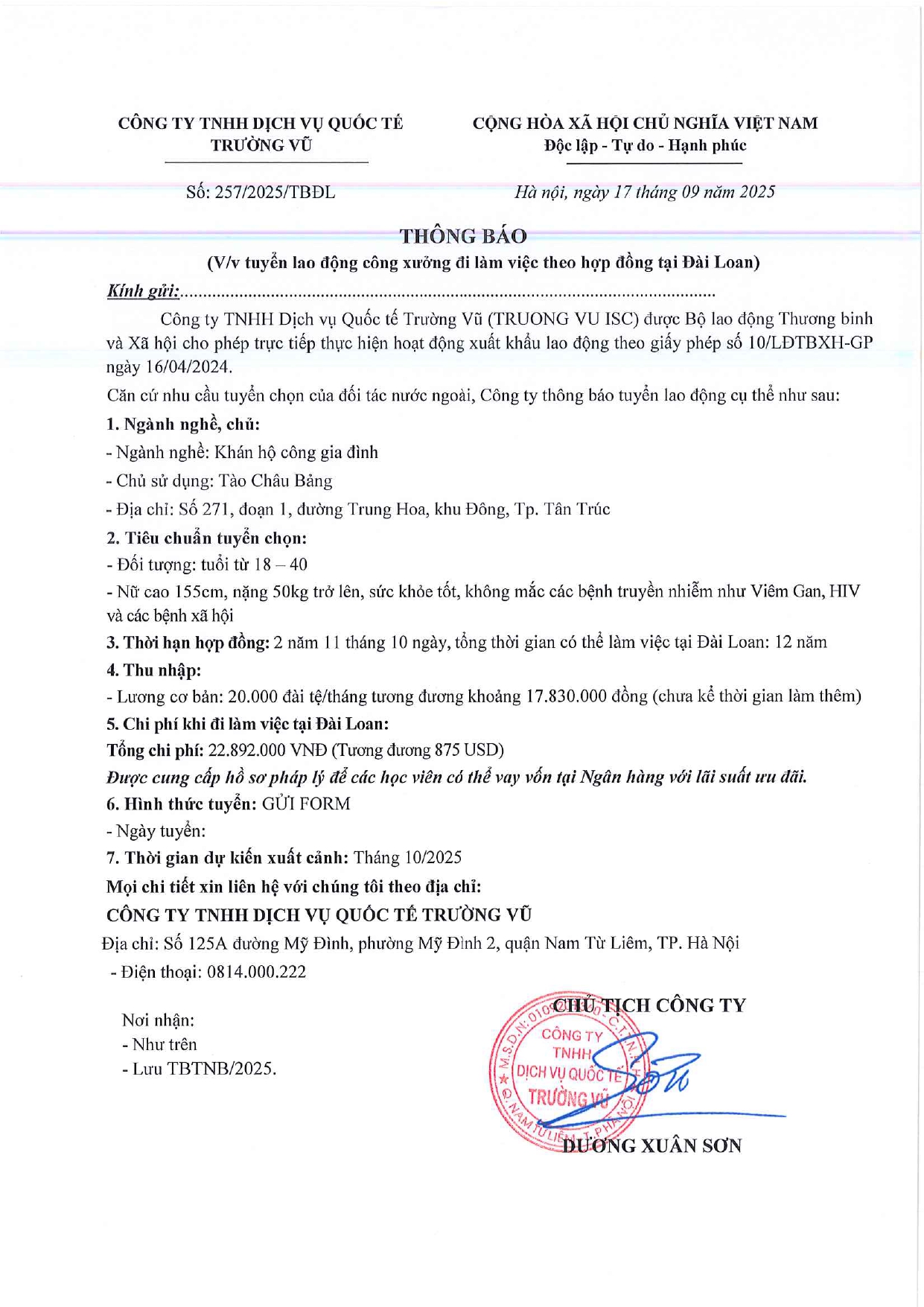 Tin tức, Tin tức về thị trường lao động, Tuyển dụngThông báo tuyển dụng lao động làm việc tại Đài Loan tháng 9 năm 2025 17 Tháng 10, 202512 Tháng mười một, 2025 - Trường vũ - 188 lượt xem