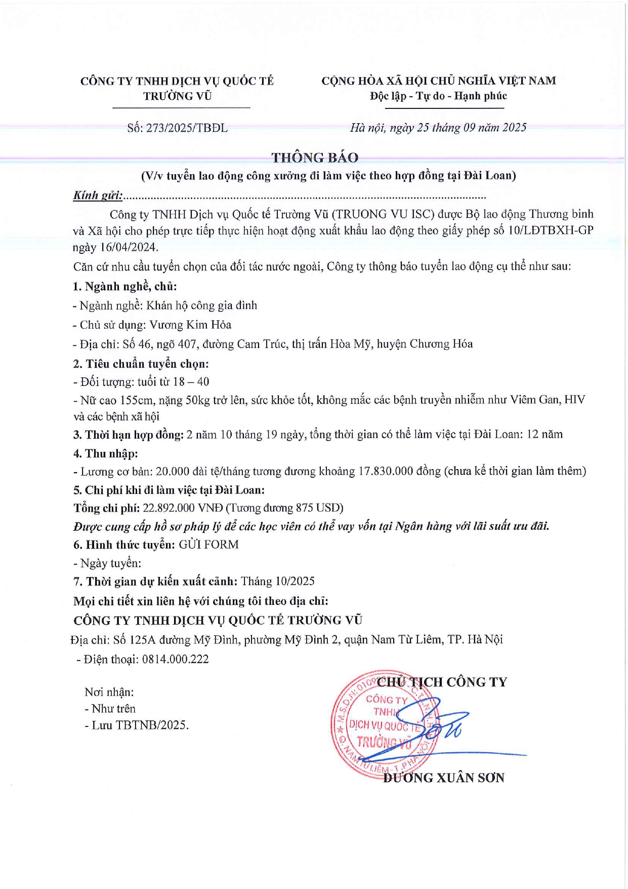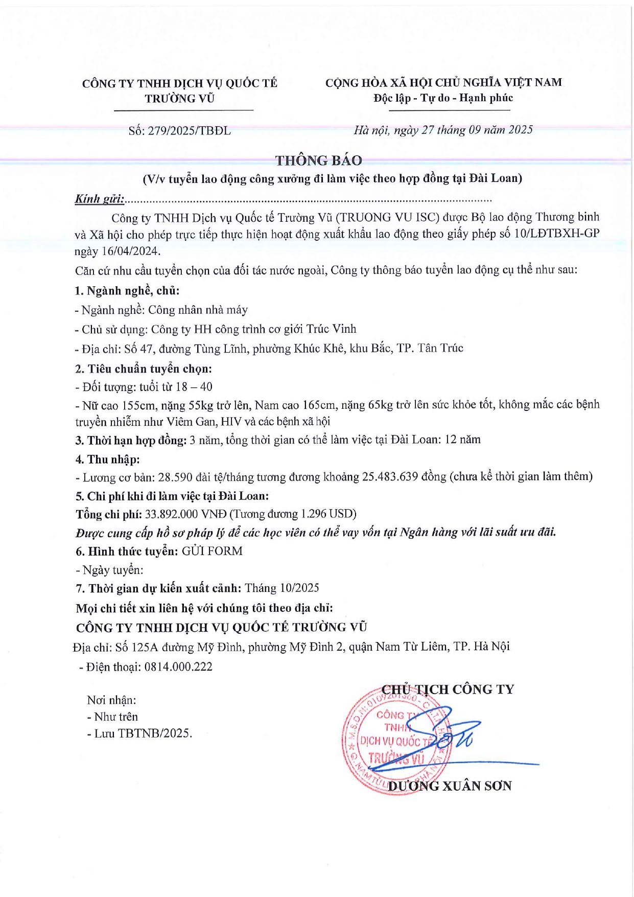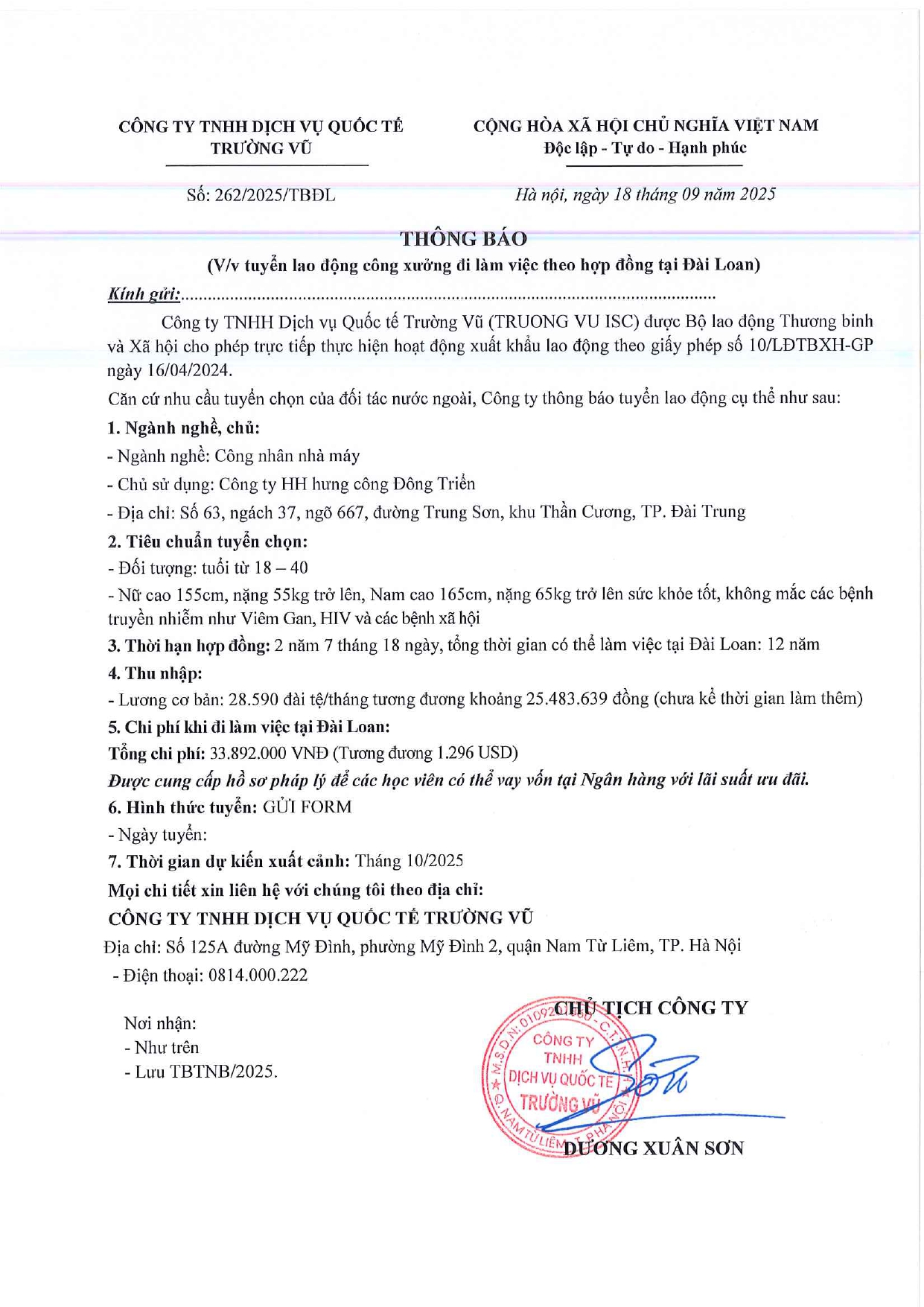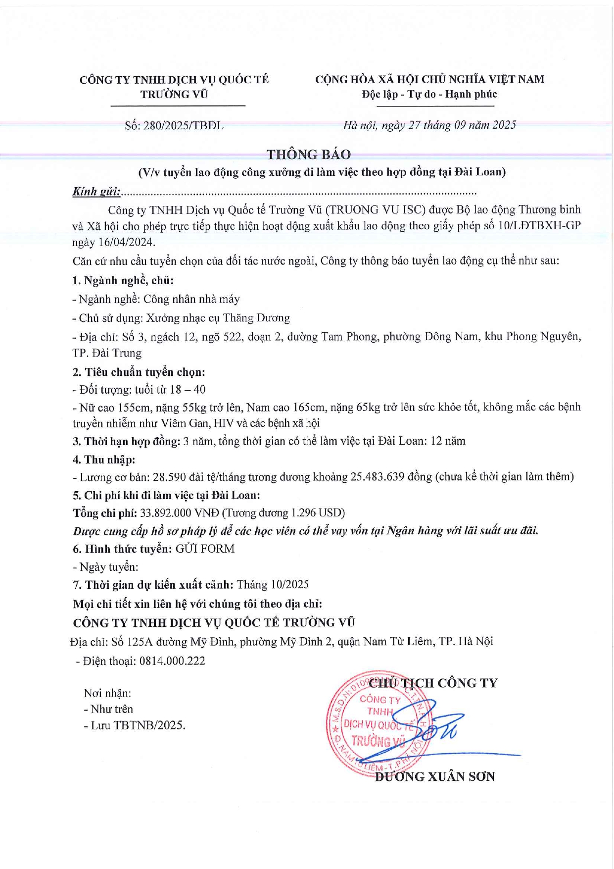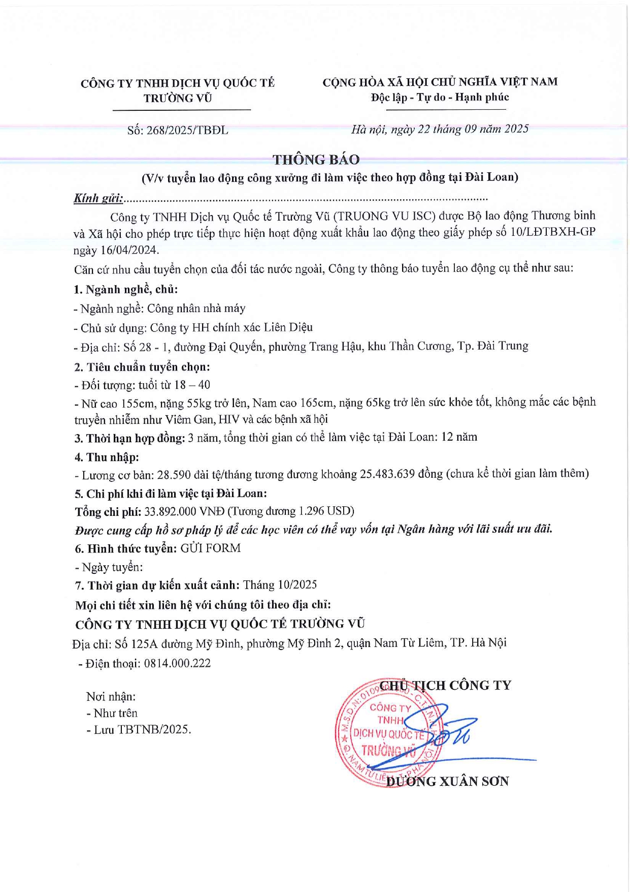 Tin tức, Tin tức về thị trường lao động, Tuyển dụngThông báo tuyển dụng lao động làm việc tại Đài Loan tháng 9 năm 2025 17 Tháng 10, 202512 Tháng mười một, 2025 - Trường vũ - 188 lượt xem